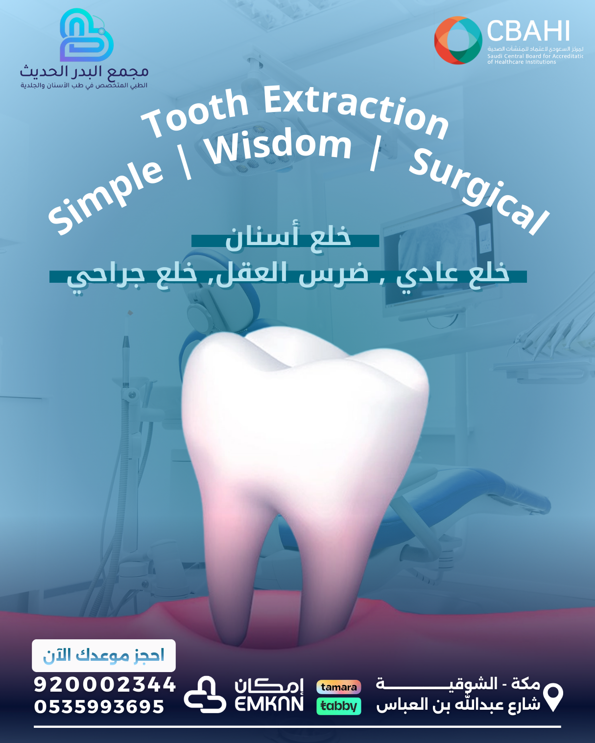 خدمة خلع الأسنان هي إجراء طبي يتم فيه إزالة السن المتضرر أو الذي لا يمكن إنقاذه نتيجة للتسوس العميق، التهابات اللثة، أو أي مشاكل أخرى قد تؤثر على صحة الفم. يتم إجراء الخلع تحت إشراف طبيب أسنان متخصص باستخدام تقنيات وآليات حديثة لضمان راحة المريض وتقليل الألم. تُعد هذه الخدمة حلاً فعالًا لاستعادة الصحة الفموية ومنع انتشار العدوى أو المشاكل الأخرى.
