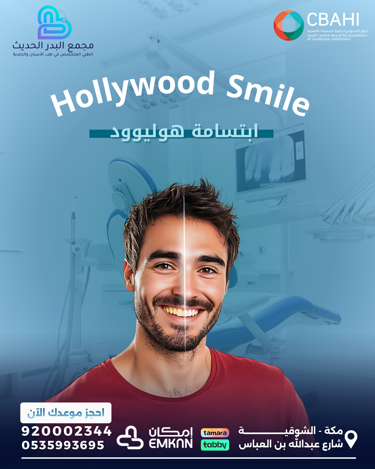 خدمة "ابتسامة هوليود" هي عملية تجميلية تهدف إلى تحسين مظهر الأسنان بشكل شامل، مما يمنح المريض ابتسامة مشرقة وجذابة على غرار ابتسامات نجوم هوليود. تتضمن الخدمة تقنيات مثل تبييض الأسنان، تركيب القشور الخزفية (فينيرز) لتغطية العيوب، تقويم الأسنان، وعلاج التشوهات المختلفة في الشكل أو اللون. تعتبر هذه الخدمة مثالية لمن يبحث عن تحسين مظهر ابتسامته بشكل سريع وملحوظ، مع نتائج تدوم طويلًا.